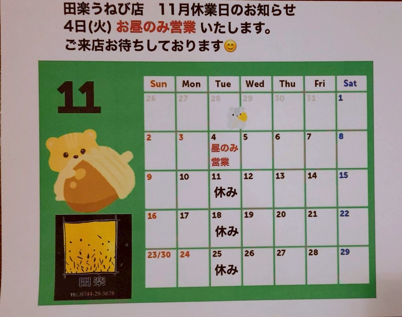 11月は11、18、25日が定休日です。(4日は昼のみ営業)