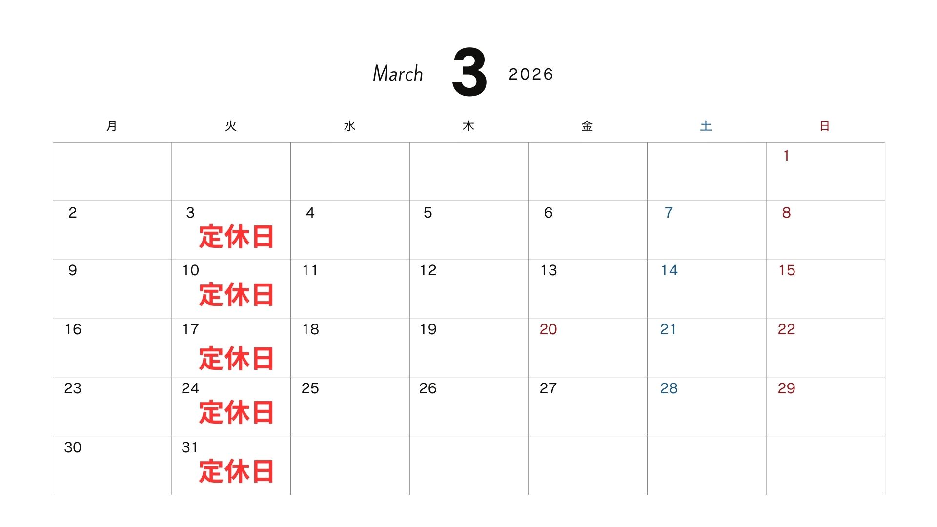 3月は3、10、17、24、31日が定休日です。